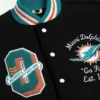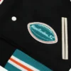 Featuring a front snap-button closure, the jacket is easy to wear and remove. Ribbed cuffs, hem, and collar provide a secure fit while keeping warmth inside. Its teal and orange color scheme proudly displays Dolphins loyalty without compromising style. The jacket’s premium stitching ensures long-lasting wear, maintaining its sharp appearance even after frequent use.
