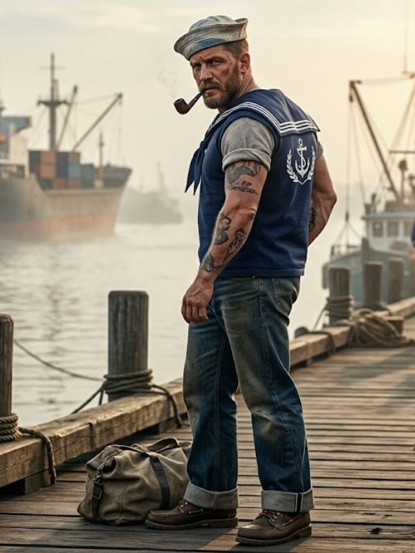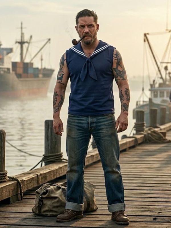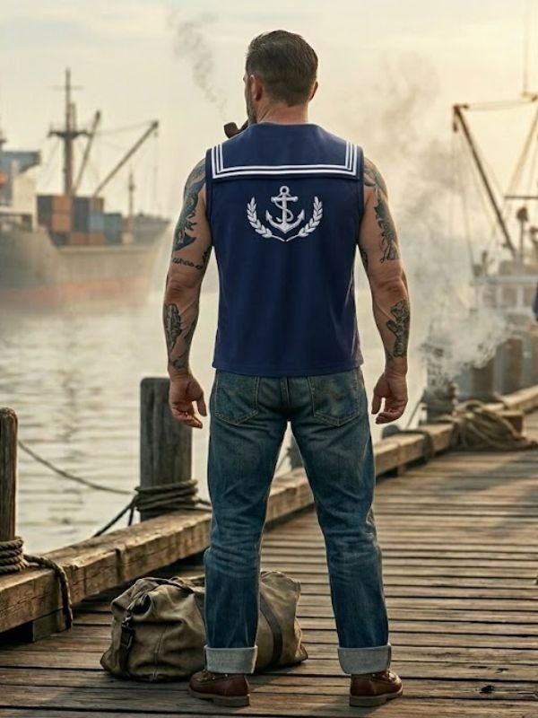 Step into bold nautical fashion with the Tom Hardy Popeye The Sailor Man 2 Inspired Navy Blue Sleeveless Sailor Top. Inspired by a modern live-action sailor concept, this top captures strength, confidence, and timeless maritime tradition in one standout piece.